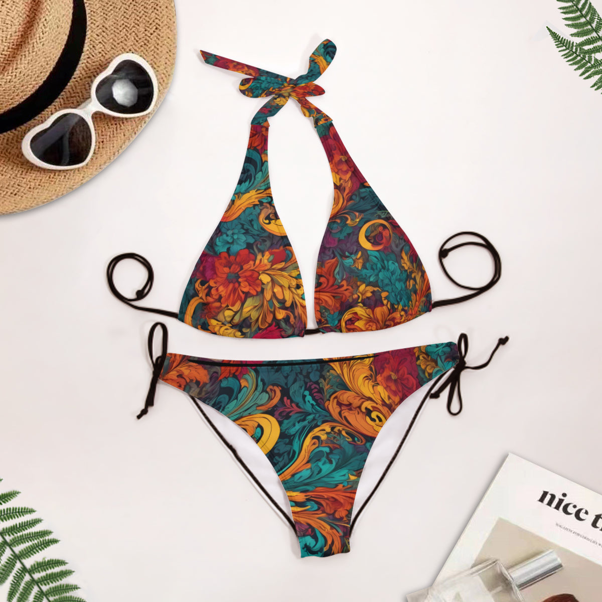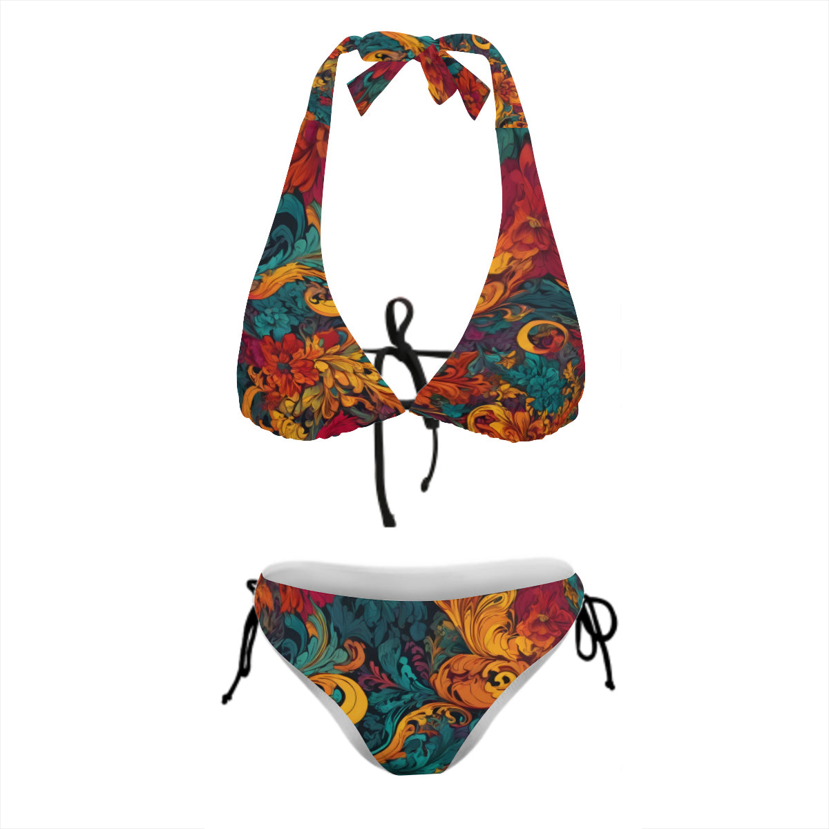 - Halter bikini triangle top with straps on both sides and triangle bikini swim trunks.