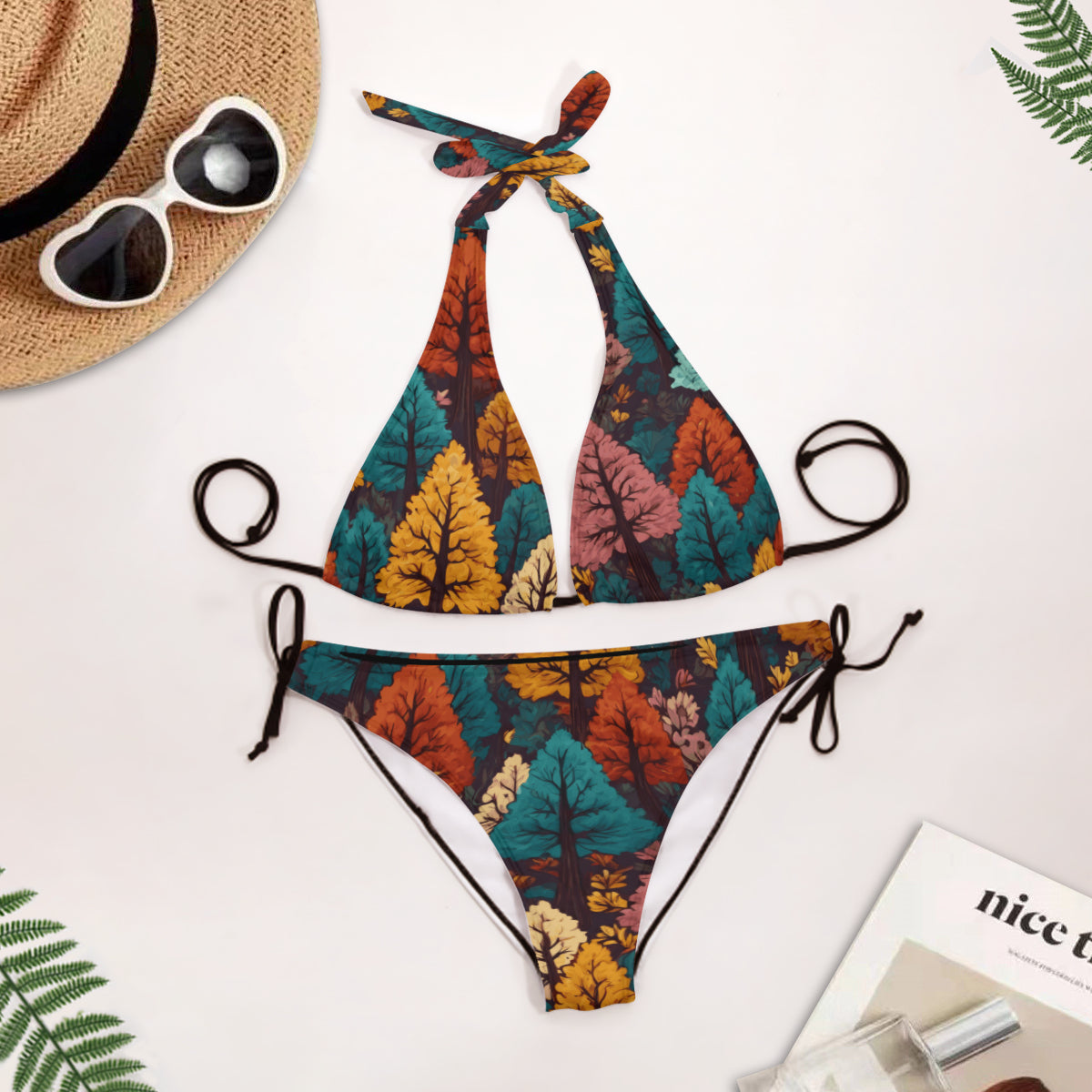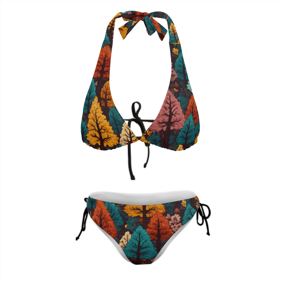 - Halter bikini triangle top with straps on both sides and triangle bikini swim trunks.