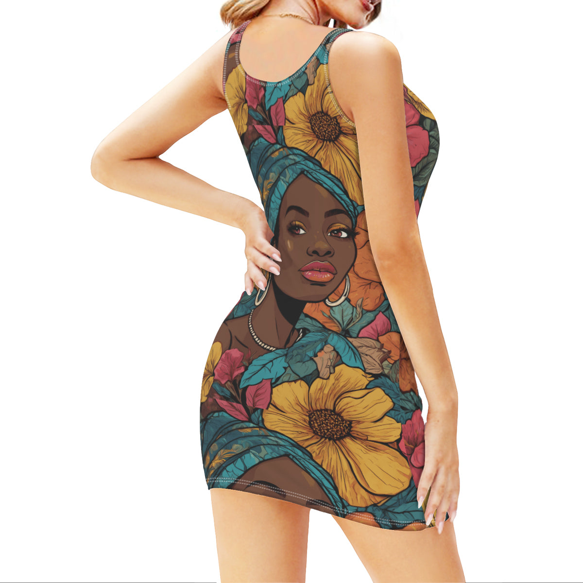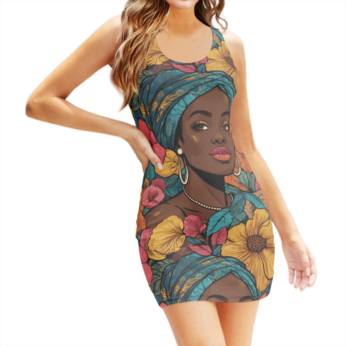 Melanin Queen All-Over Print Sleeveless Slim-Fit Euro-Size Tank Slip Dress | Polyester