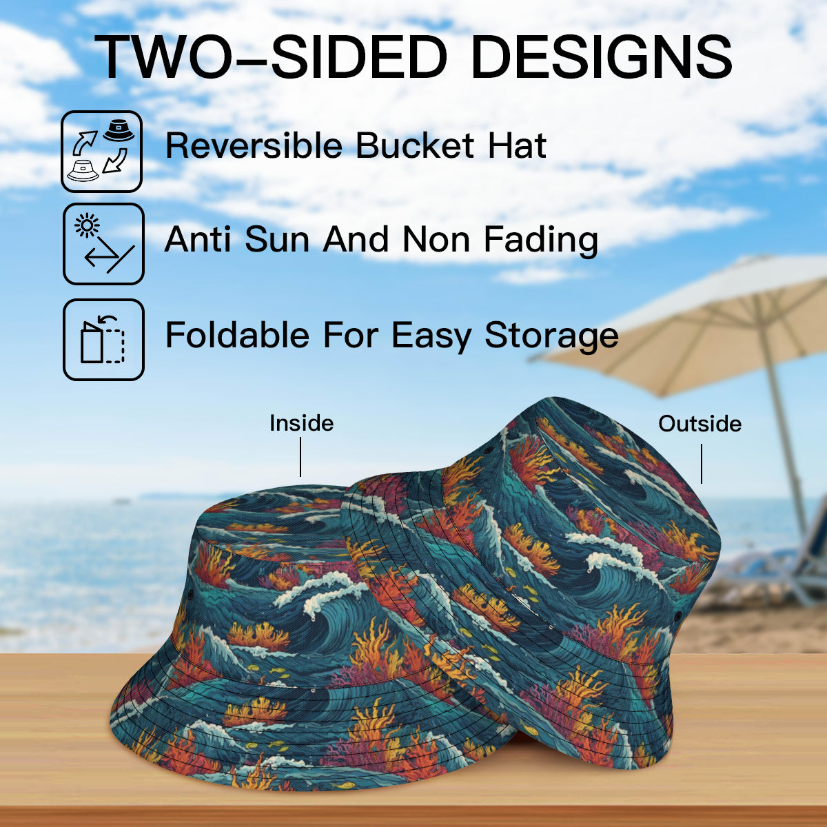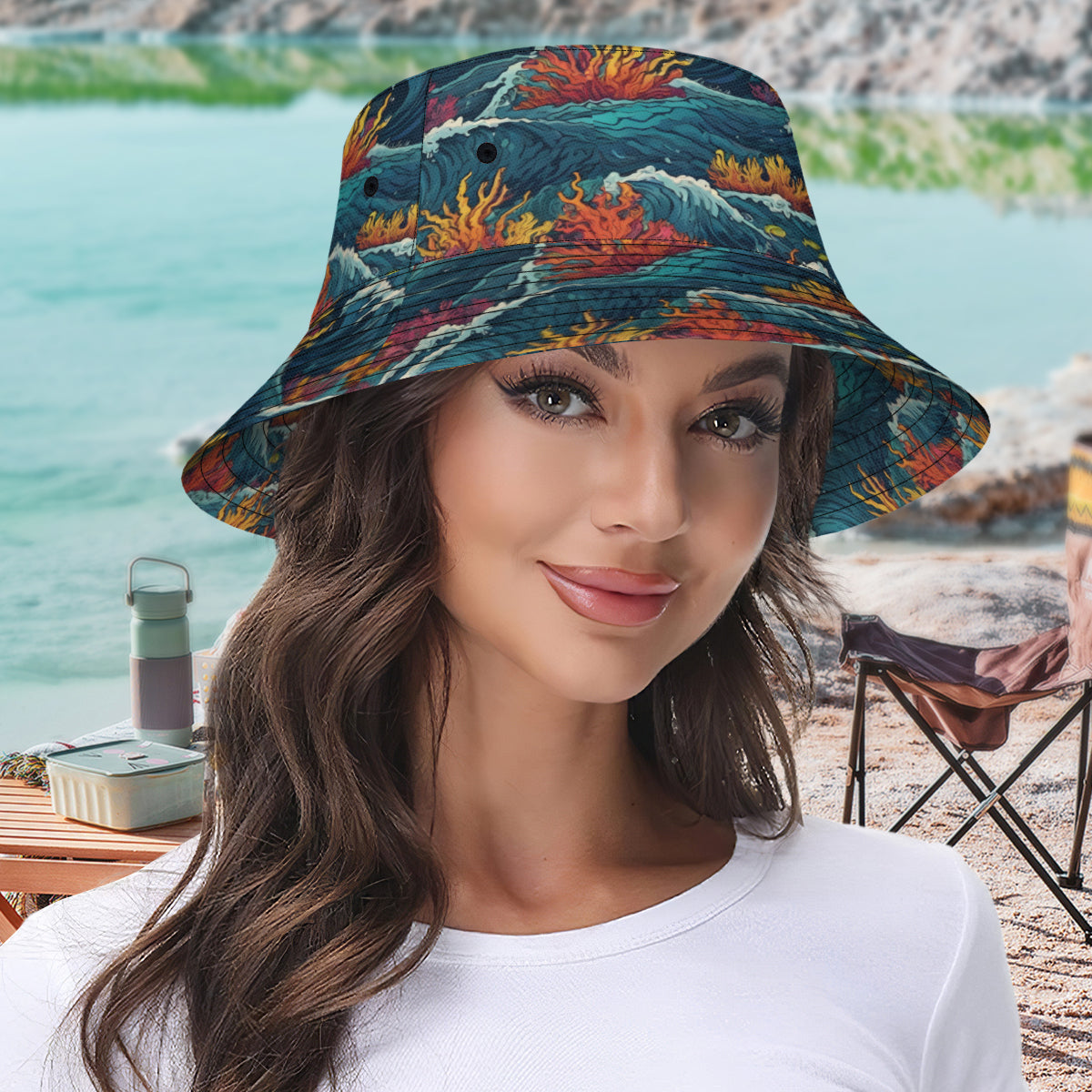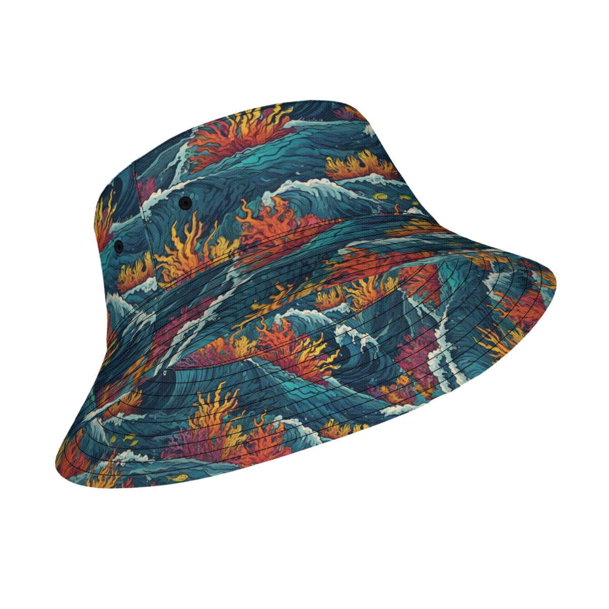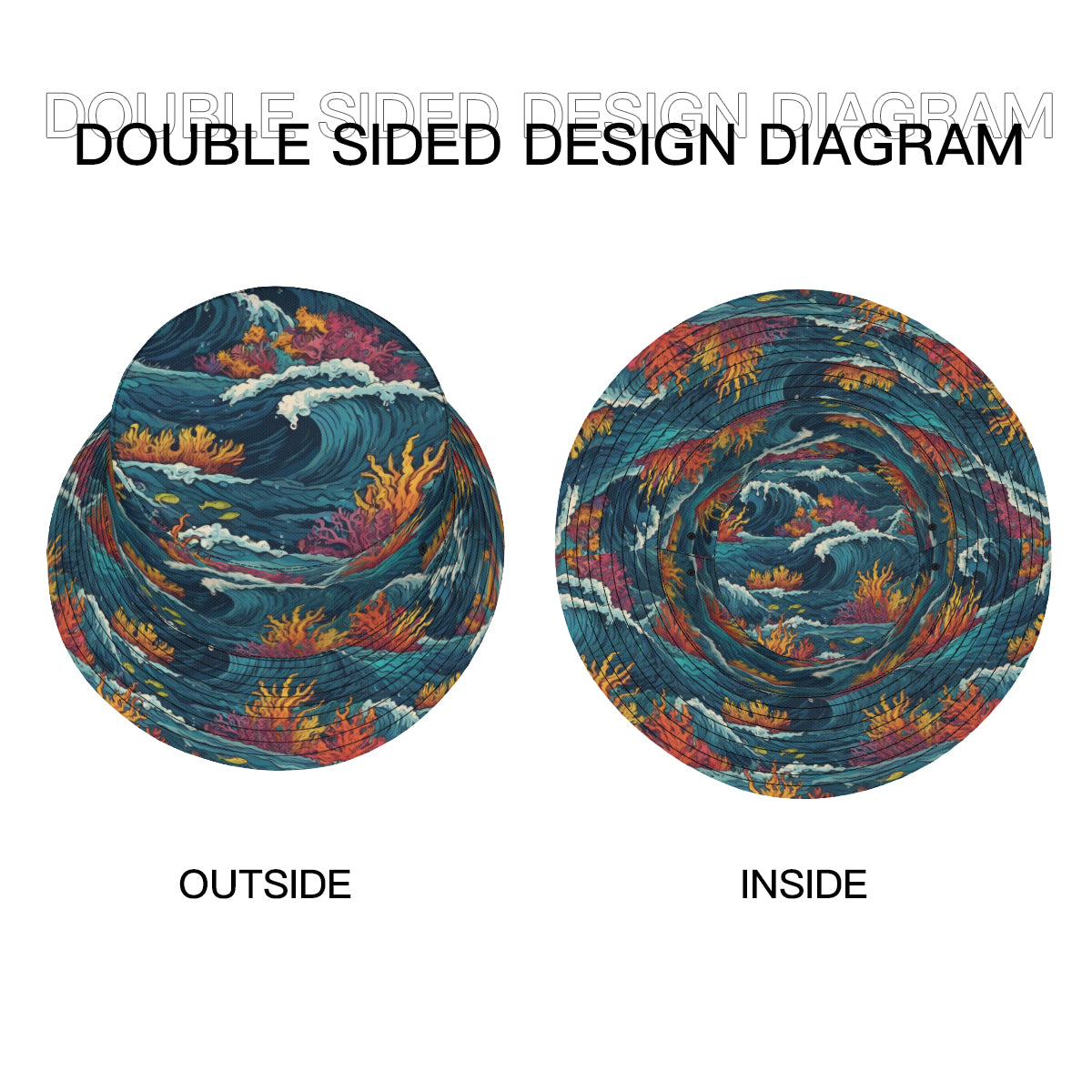 Design description: Double-Sided All-Over Printing Ocean Waves Material Fisherman Hat | Polyester