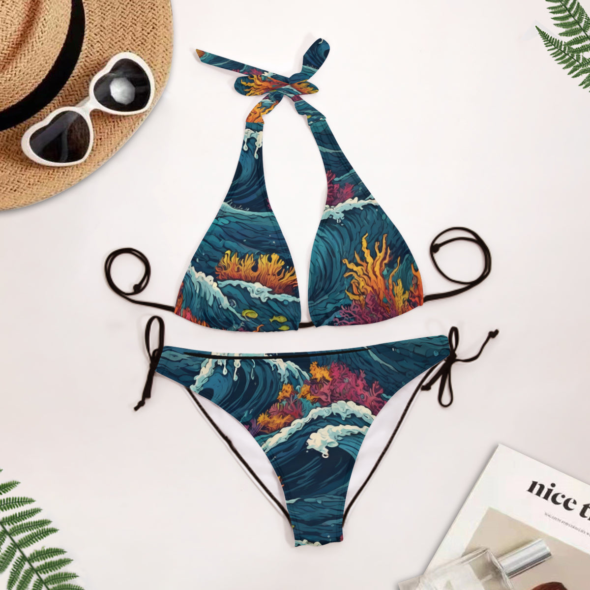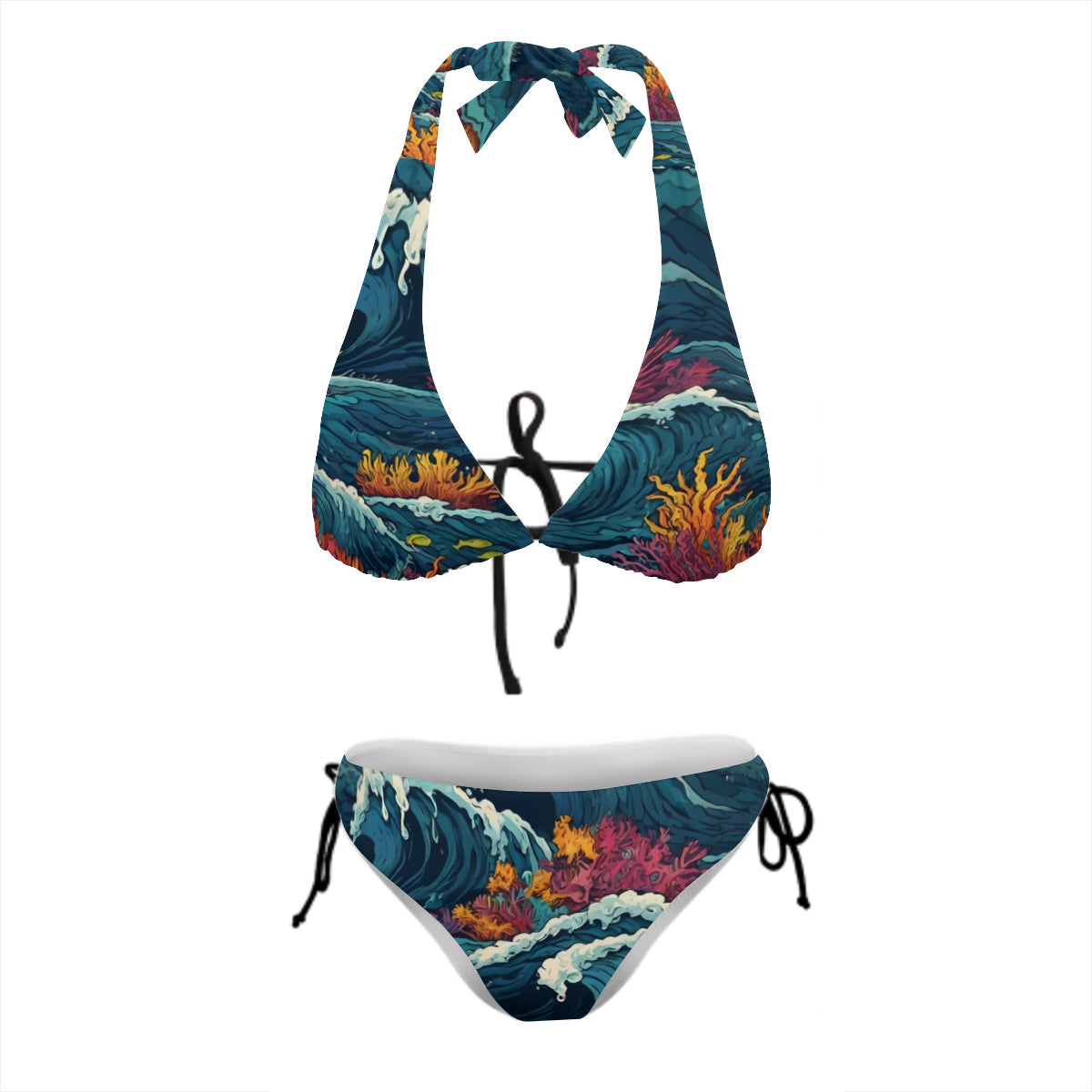 - Halter bikini triangle top with straps on both sides and triangle bikini swim trunks.