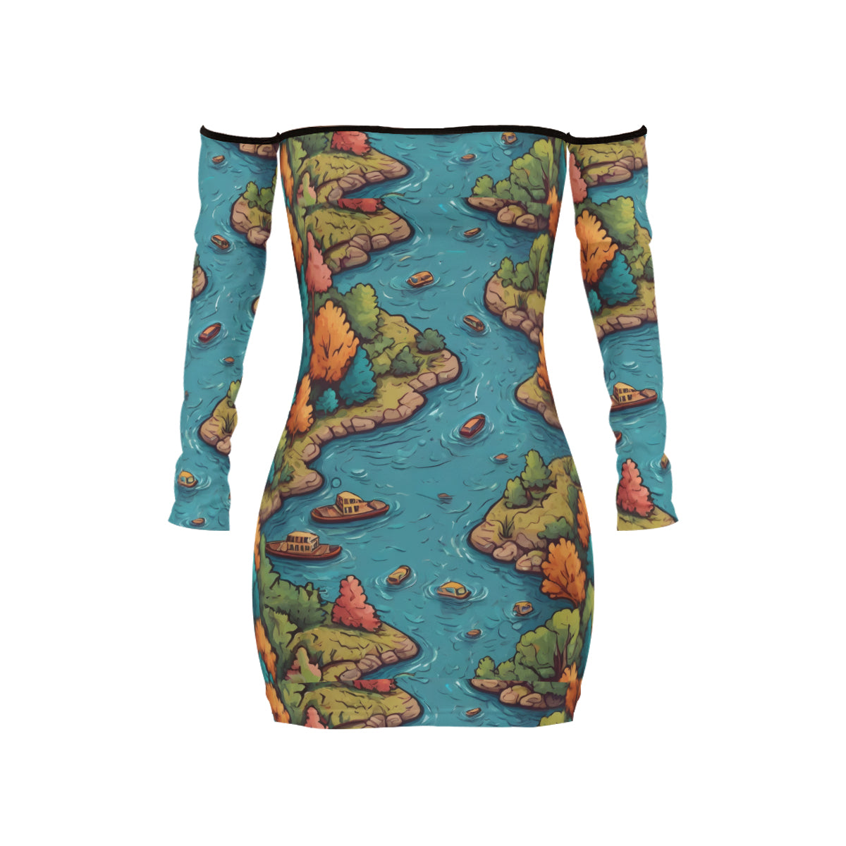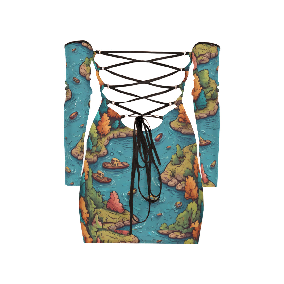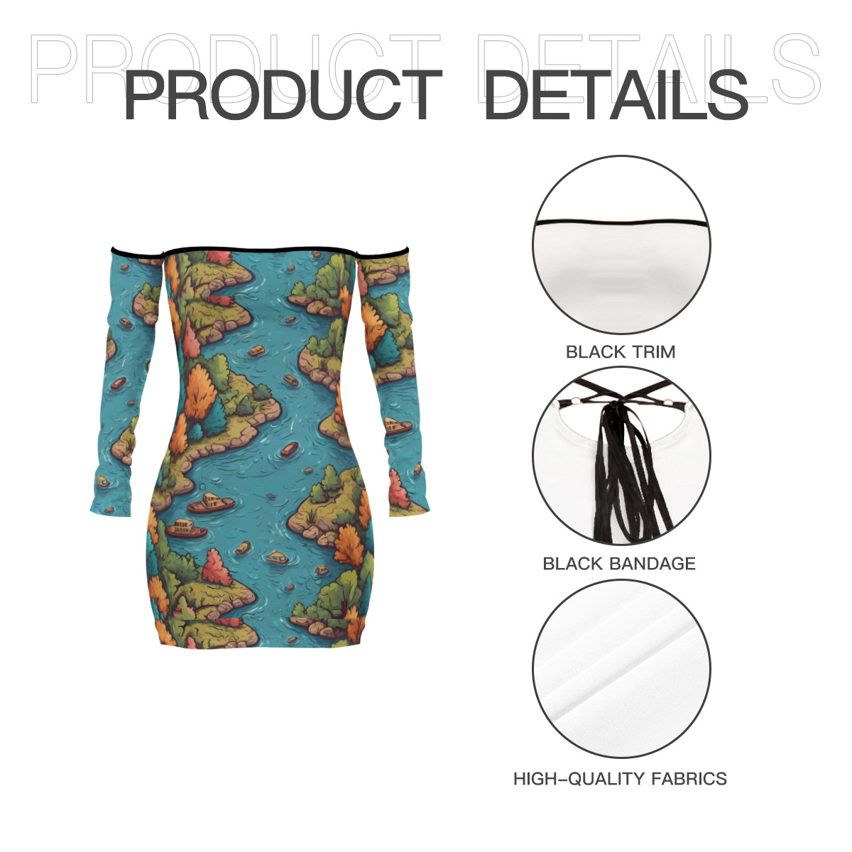 Design area: All-Over Print River Front Design Women's Off-shoulder Back Lace-up Dress | Polyester