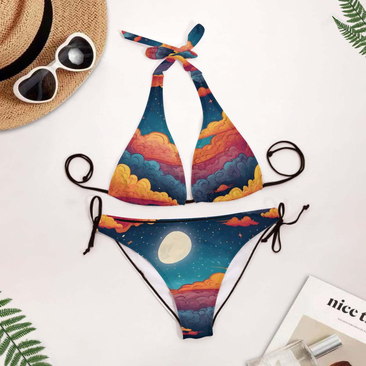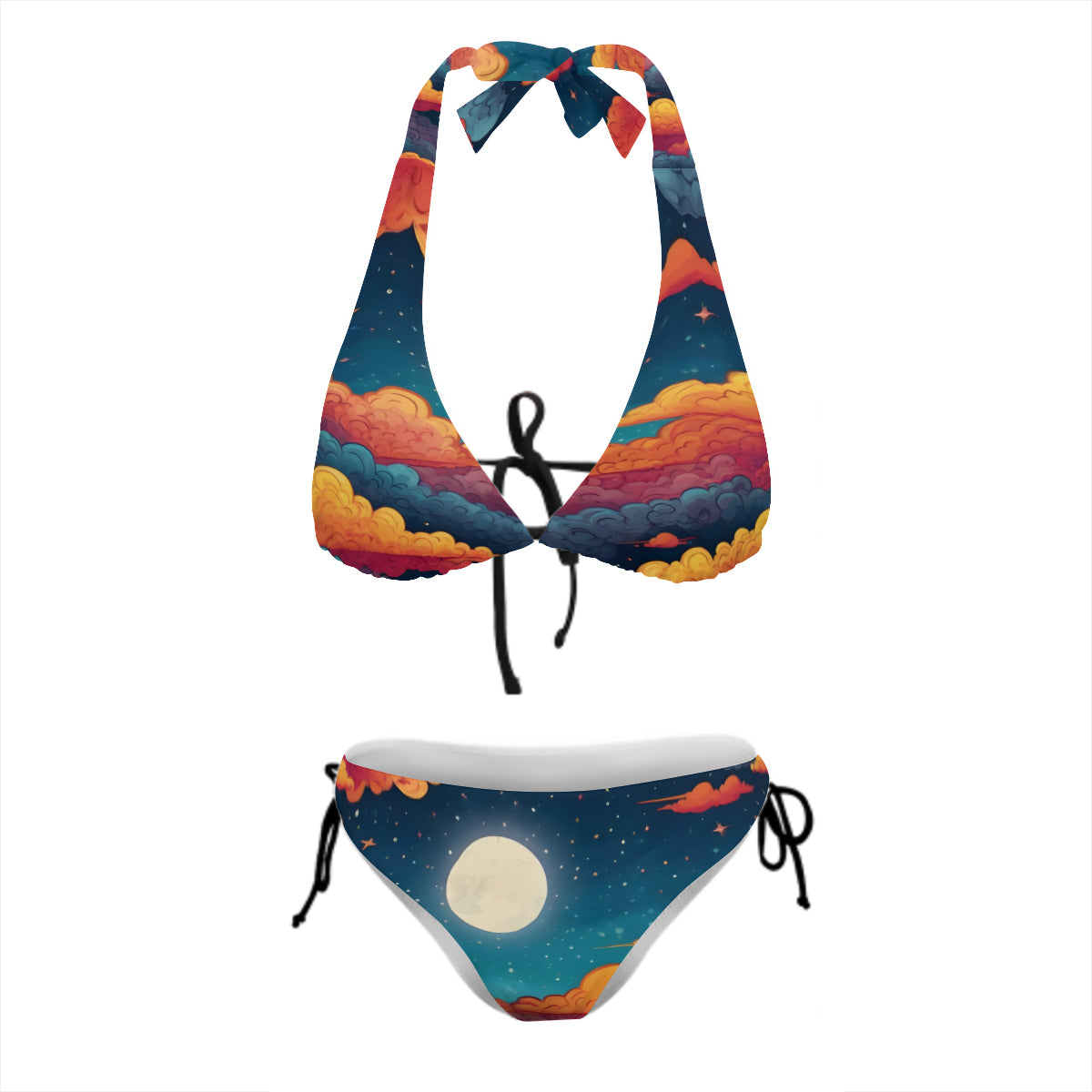 - Halter bikini triangle top with straps on both sides and triangle bikini swim trunks.